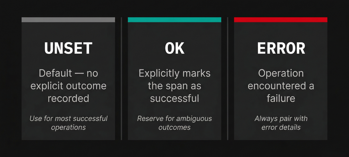 A span's status indicates whether the operation it represents succeeded or failed. OpenTelemetry defines three status codes: