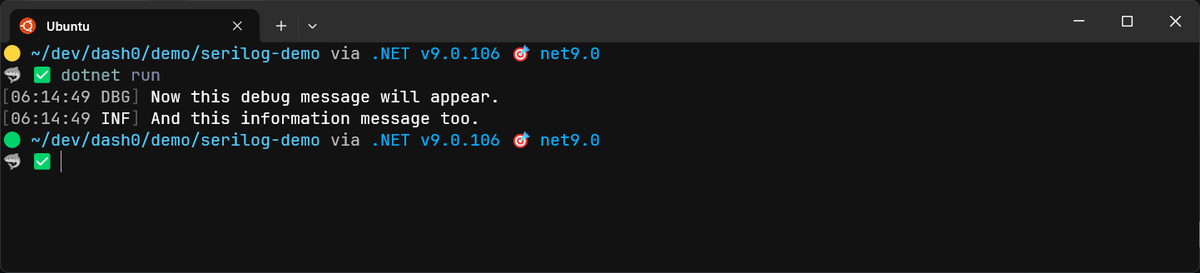 cs123456789Log.Logger = new LoggerConfiguration().MinimumLevel.Debug() // Set the global minimum level.WriteTo.Console().CreateLogger();Log.Debug("Now this debug message will appear.");Log.Information("And this information message too.");Log.CloseAndFlush();