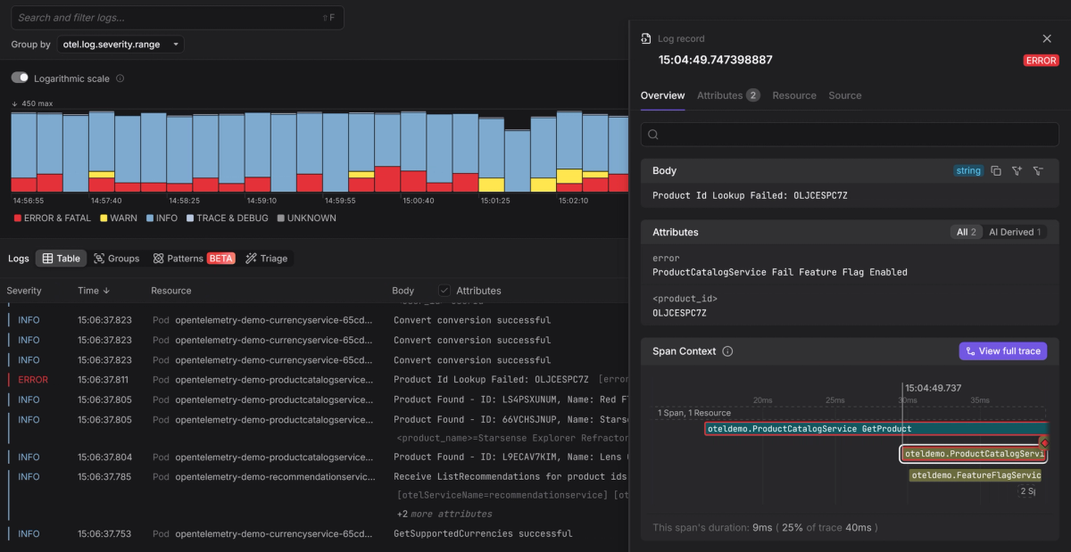 Dash0 treats log levels as a first-class input to guide your attention, not just a filter. Higher-severity events naturally rise to the surface, making errors and warnings easier to spot during day-to-day monitoring, while informational and debug logs remain available without overwhelming the view.