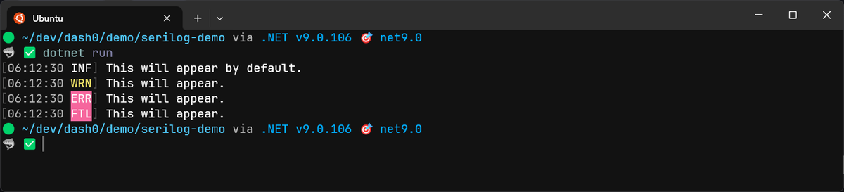 cs1234567891011121314using Serilog;Log.Logger = new LoggerConfiguration().WriteTo.Console().CreateLogger();Log.Verbose("This will not appear."); // Lower than InformationLog.Debug("This will also not appear."); // Lower than InformationLog.Information("This will appear by default.");Log.Warning("This will appear.");Log.Error("This will appear.");Log.Fatal("This will appear.");Log.CloseAndFlush();