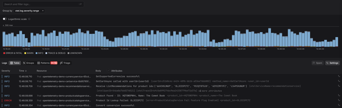 At Dash0, severity is shown as a clear visual hierarchy so that errors and warnings stand out immediately, while less severe logs stay in the background unless you deliberately drill in.