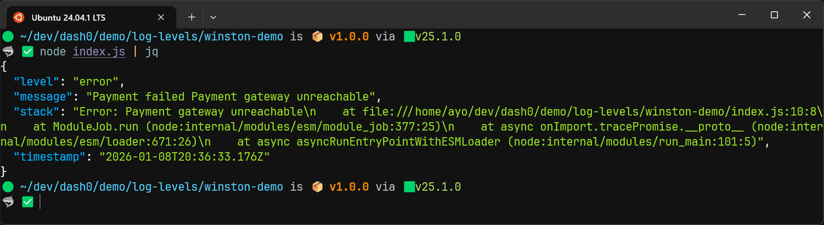 JavaScript123456789101112const { combine, timestamp, json, errors } = winston.format;const logger = winston.createLogger({format: combine(errors({ stack: true }), timestamp(), json()),transports: [new winston.transports.Console()],});try {throw new Error("Payment gateway unreachable");} catch (err) {logger.error("Payment failed", err);}